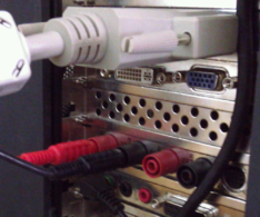 ØIf the CC is supplied with an internal DMM, standard is a NI-4065PCI DMM, then connect the RED and BLACK Banana Jacks to the rear-most jack sockets located on the left side panel of the computer body, marked CATII Hi for red fly-lead and CATII Lo for the black fly-lead (shown by the 'resistor' symbol in the diagram below); other peripheral equipment and connection methods can be found under the Using Peripheral Test Equipment topic.