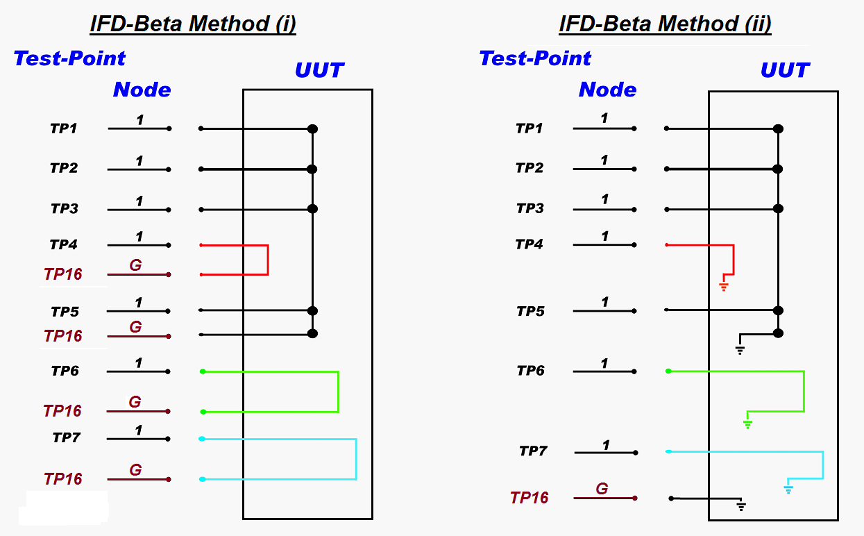 Ø IFD-Beta Method (i) illustrates a single ganged 'test ground' line going to TP16 and the internals of the UUT used as return path.