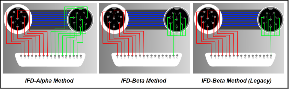 The diagrams below show the different ways in which even a simple 8-core harness can be connected to the IFD™ TE. As described under Designing an ITA, there are pros and cons for the configurations shown, and these are worth of understanding before designing and building an ITA.