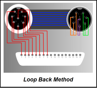 In the Loop Back Method shown below, the test points within the Male connector (on the right) are interconnected. For example, the lines between Male-4 & Female-4 and Male-8 & Female-8 will be tested on a common node. Therefore, if a fault is found on this node, it will be indeterminate if the fault is on Line4 or Line8. However, this method does reduce the test point count, and, say for instance the Male connector was on the tail of a large aircraft, it would reduce the need for long cable runs in the ITA.