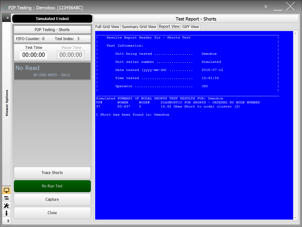 The Test Report shown in the blue field, provides the User with a fully summary and details of the test.  This report can be copied and pasted into a document of the User's choice.  When this application is closed, this report is presented in the same format to the User in the main NODES™ application.