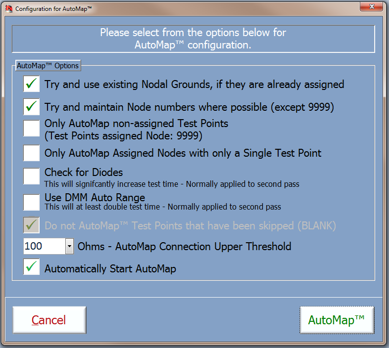 The AutoMap process can be used on multiple occasions, with various options checked or unchecked for second or third runs. In addition, AutoMap can be used to verify an already defined UUT as a cross-check of its configuration, for example used for a circuit upgrade or modification.