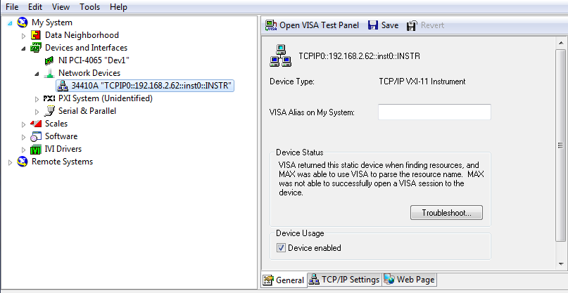 Ø If installed, open NI-MAX and navigate to the Network Devices and select 34410A, from here select the Web Page option at the bottom of the page to show the settings of the Agilent.