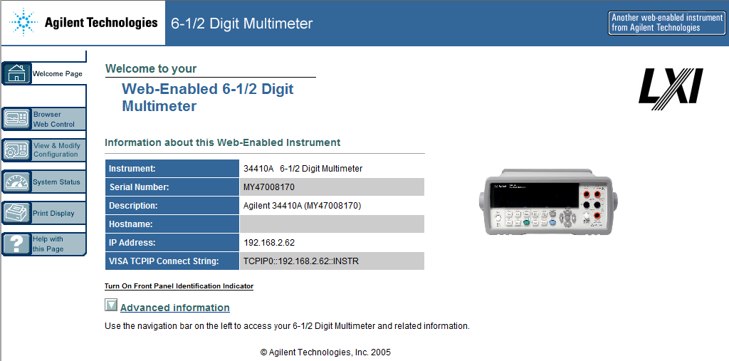 If the IP address is known (default is 169.254.4.10), then this IP can be entered in a Web Browser and the Agilent's Welcome page will be displayed.