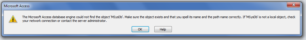 The User may see something as shown below, ie it says that the MSysDB could not be found.  Or it simply does not start at all.