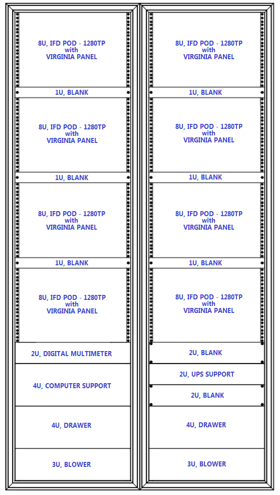 Shown below is a typical layout of the Dual Bay 19" rack for the IDFIS™.  Layout varies depending on customer requirements.  The example shows 8 Pods of 1280 TP each.  Blanks can be fitted to any position depending on the TP count requirements.