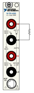 Ø     If the CC is supplied with an internal DMM, standard is a NI-4065PCI DMM, then connect the RED and BLACK Banana Jacks to the rear-most jack sockets located on the left side panel of the computer body, marked CATII Hi for red fly-lead and CATII Lo for the black fly-lead (shown by the 'resistor' symbol in the diagram below); other peripheral equipment and connection methods can be found under the Using Peripheral Test Equipment topic.