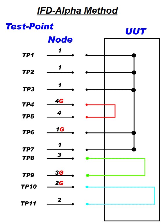 Using the IFD-Alpha method provides the User with full access to the entire testing functionality and fully flexibility in carrying out ad-hoc testing. Within this mode, the nodes become discrete and each node requires a nodal ground. The maximum number of test lines that is needed to be connected in this mode is shown below as 11; for