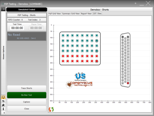 An example of a completed Shorts Test is shown below. The jade coloured TP show those TPs have passed, and the red coloured TP show a fail. However this only shows that there is a possible short within a cluster of node to another node. This fault now needs to be found and isolated using Trace Testing.