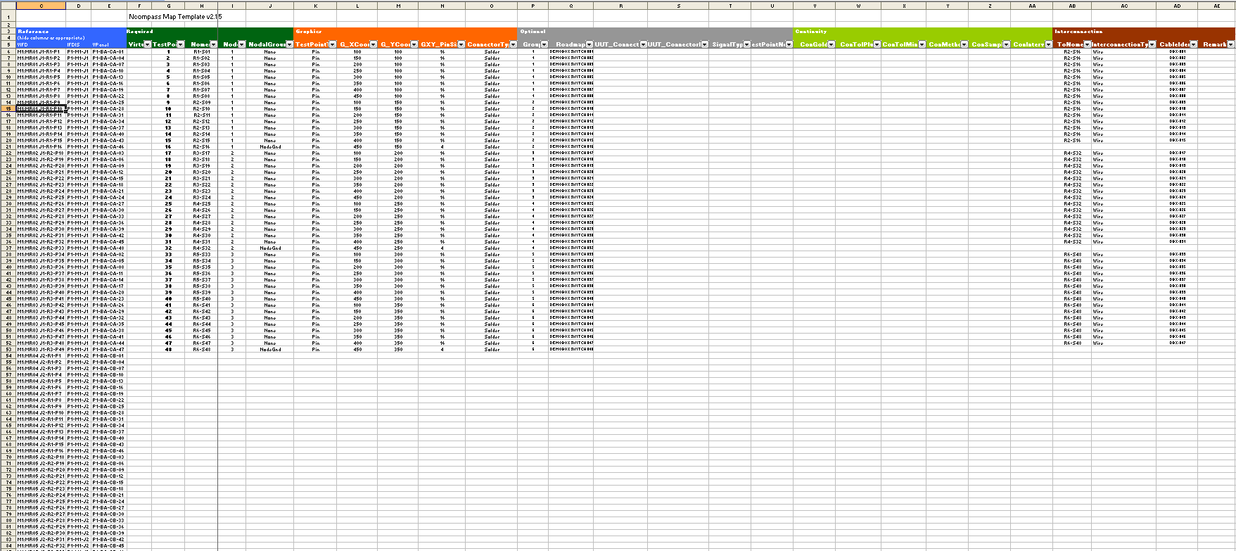 Green columns - Test Point data - mandatory fields and they have to be populated. TestPoint, Nomen fields must be unique. Gaps in the TestPoint field is allowed and test point numbers do not have to be sequential or fully populated.