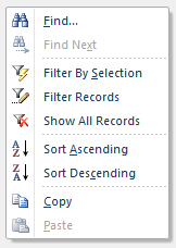 The Shortcut menu can be accessed by right-hand clicking on the main recordset area of the form.  Result records can be filtered using the Dynamic filters provided, or they can be filtered using the various options on the Shortcut menu.  Other options are also availble including:
